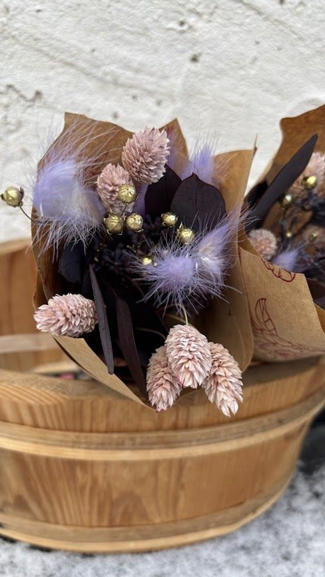 Auraméthys est un petit bouquet élégant aux teintes violettes et dorées. Composé de phalaris, de lagurus et d’eucalyptus, il allie douceur et éclat pour une décoration subtile et sophistiquée.