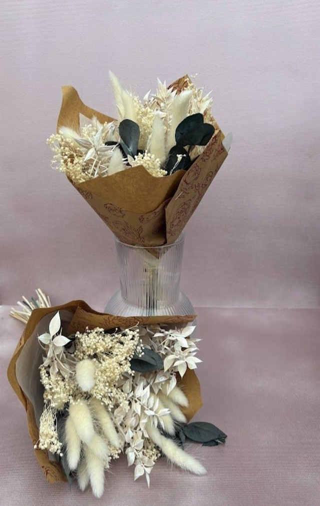 Luniflore est un bouquet raffiné entièrement composé de fleurs séchées et stabilisées aux tons blancs. Il associe la douceur du Lagurus, la texture aérienne du Broom Bloom et le feuillage délicat de l’Eucalyptus, créant une composition harmonieuse et élégante.