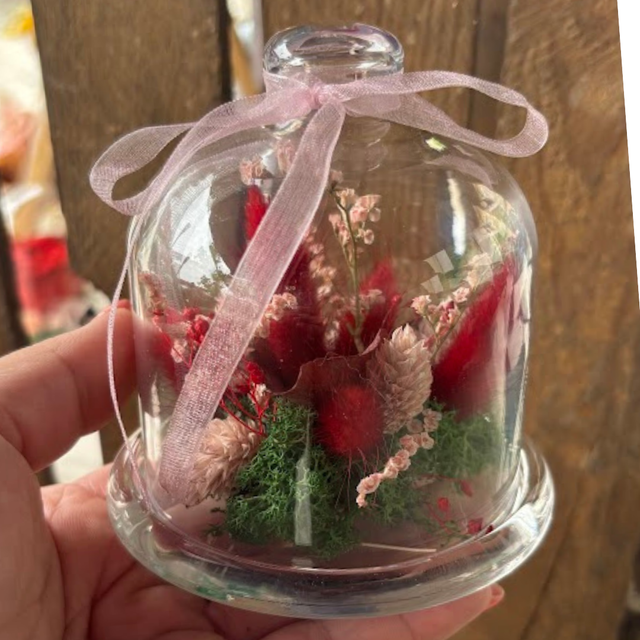 Précieuse est une cloche entièrement en verre, renfermant une délicate composition de fleurs séchées et stabilisées. Chaque pièce est pensée comme un petit bijou végétal, figé dans le temps, à contempler comme un souvenir précieux.
