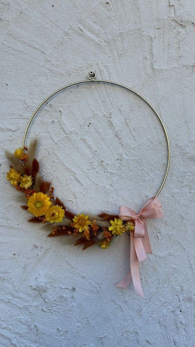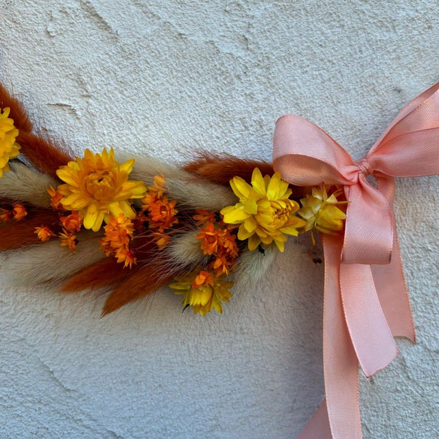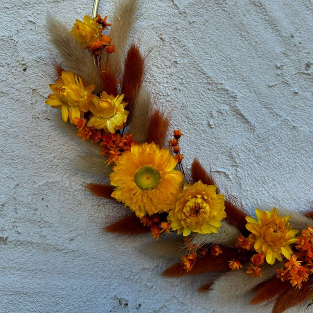 Composée de lagurus terracotta et naturel, de fleurs d’immortelle orange et jaune, et de délicates fleurettes de glixia, elle capture l’essence d’un soleil éternel.