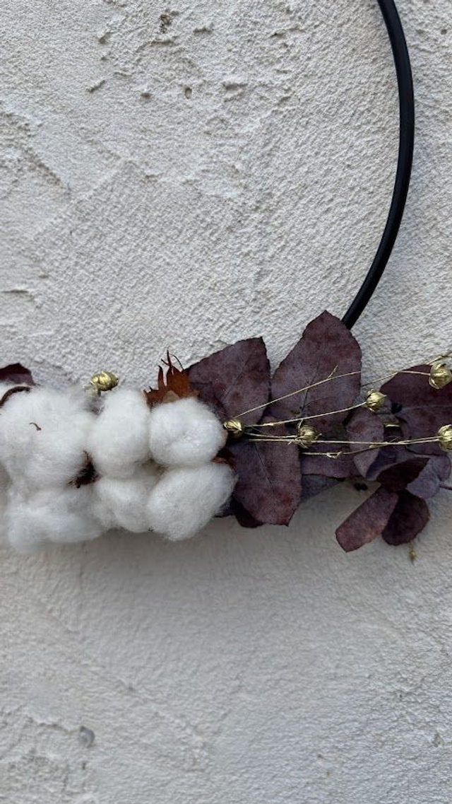 Elle harmonise fleurs de coton moelleuses, eucalyptus aux teintes rouges et de délicates fleurs de lin dorées.