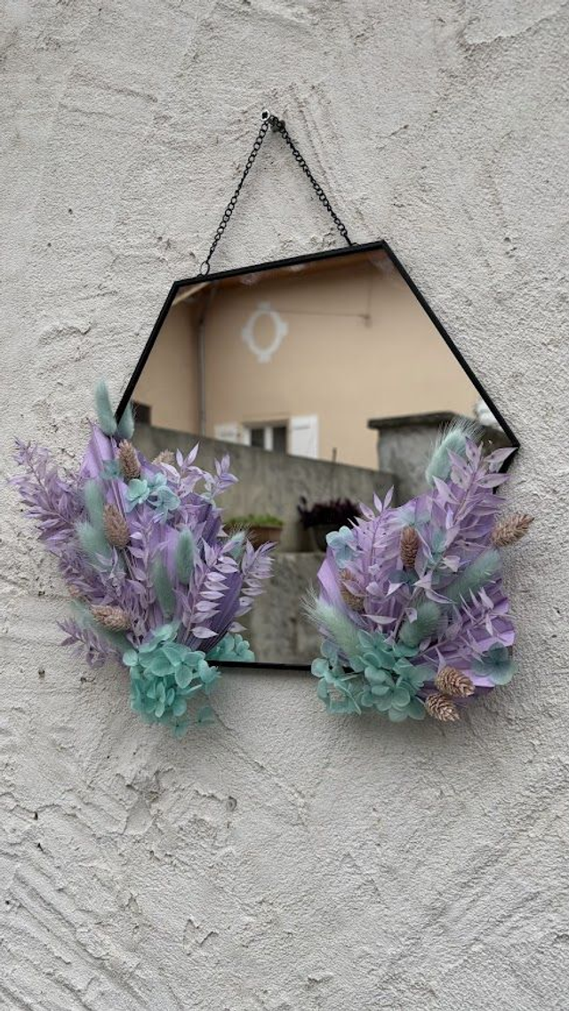 Plongez dans la magie des aurores boréales avec "Reflet d'Aurore", un miroir noir sublimé de fleurs aux teintes pastel de bleu et de violet.